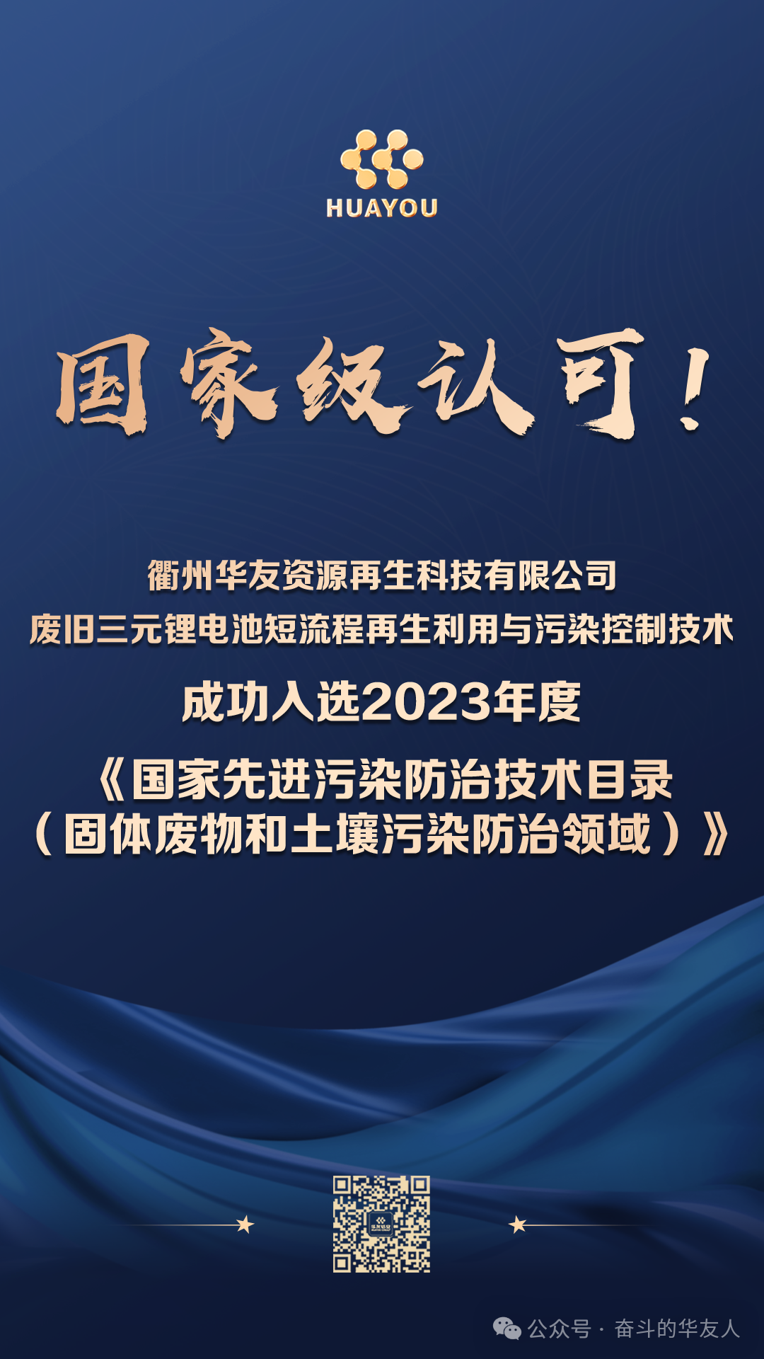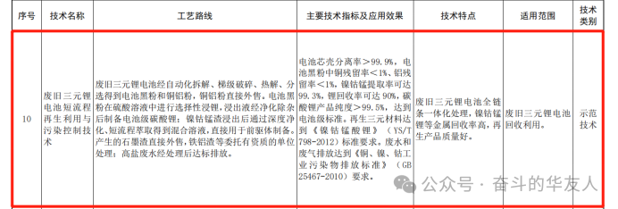 近日,衢州华友资源再生科技有限公司独立研发技术——废旧三元锂电池短流程再生利用与污染控制技术,成功入选“三年一评选”的2023年度《国家先进污染防治技术目录(固体废物和土壤污染防治领域)》(以下简称《目录》),三元锂电回收领域全国仅两家入选国家级固体废物污染防治领域示范技术。