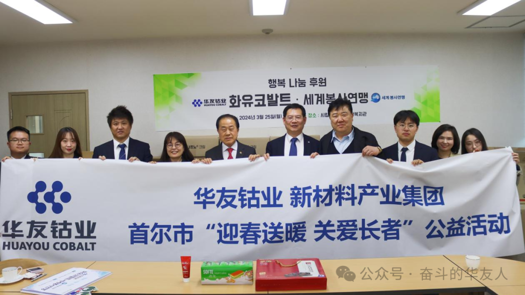 3月25日,华友钴业新材料产业集团韩国代表处携手首尔市议会金荣镐议员、世界公益联盟洪祯雨会长一同前往韩国首尔市立龙山老人综合福祉馆,共同开展“迎春送暖,关爱长者”公益活动,为长者们送去温暖和关怀。