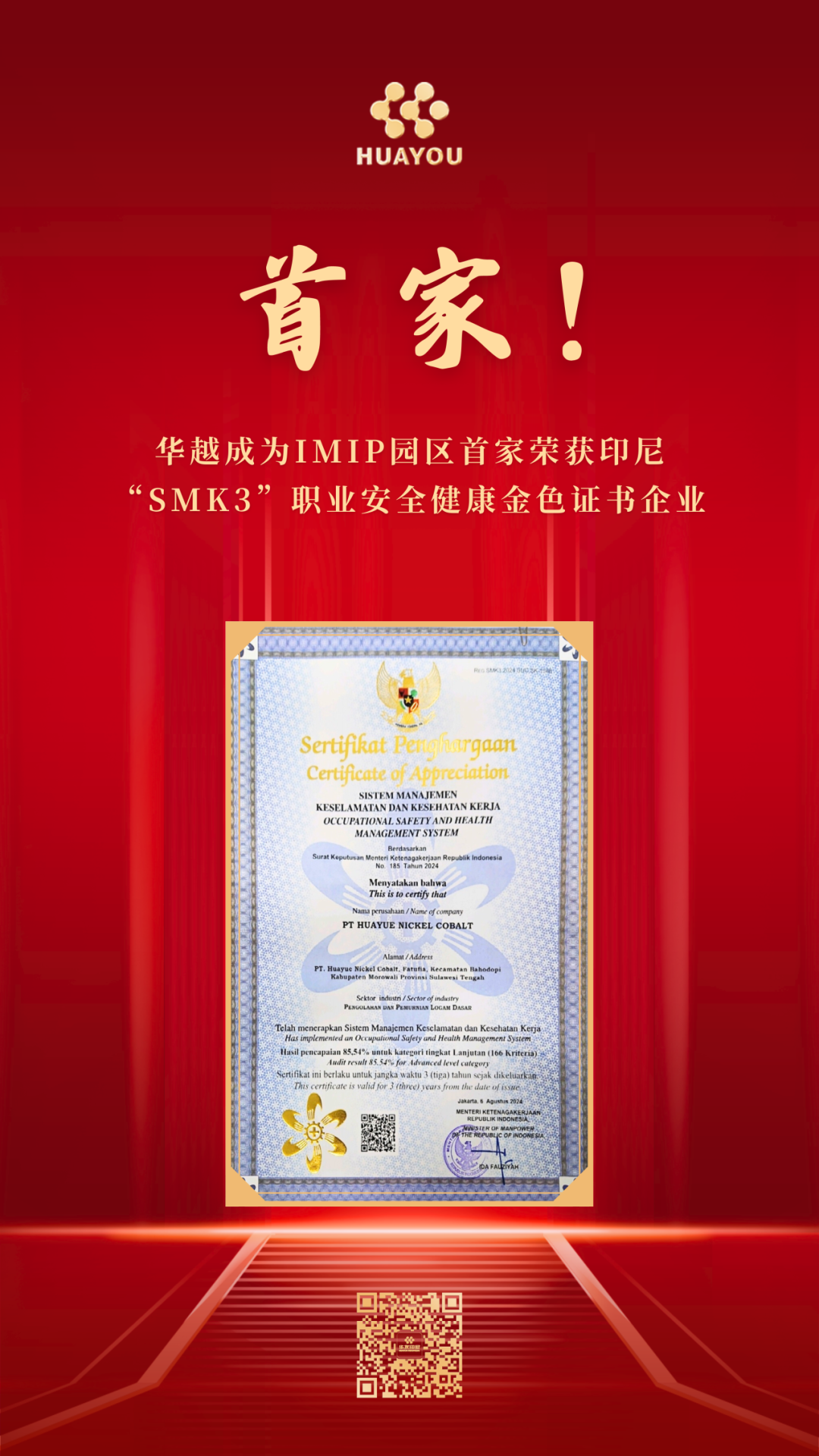 9月9日,华越镍钴(印尼)有限公司正式通过审核,获得印尼劳工部颁发的“SMK3职业安全健康”金色(最高等级)证书,成为IMIP园区50多家企业中首家获此认证的企业。