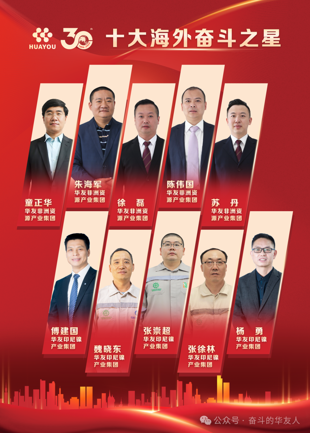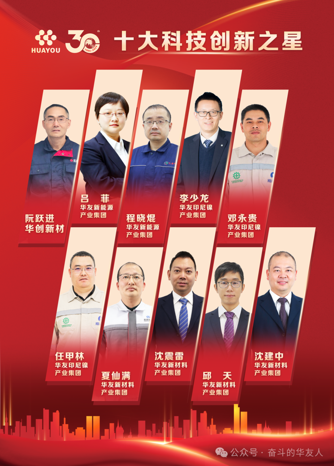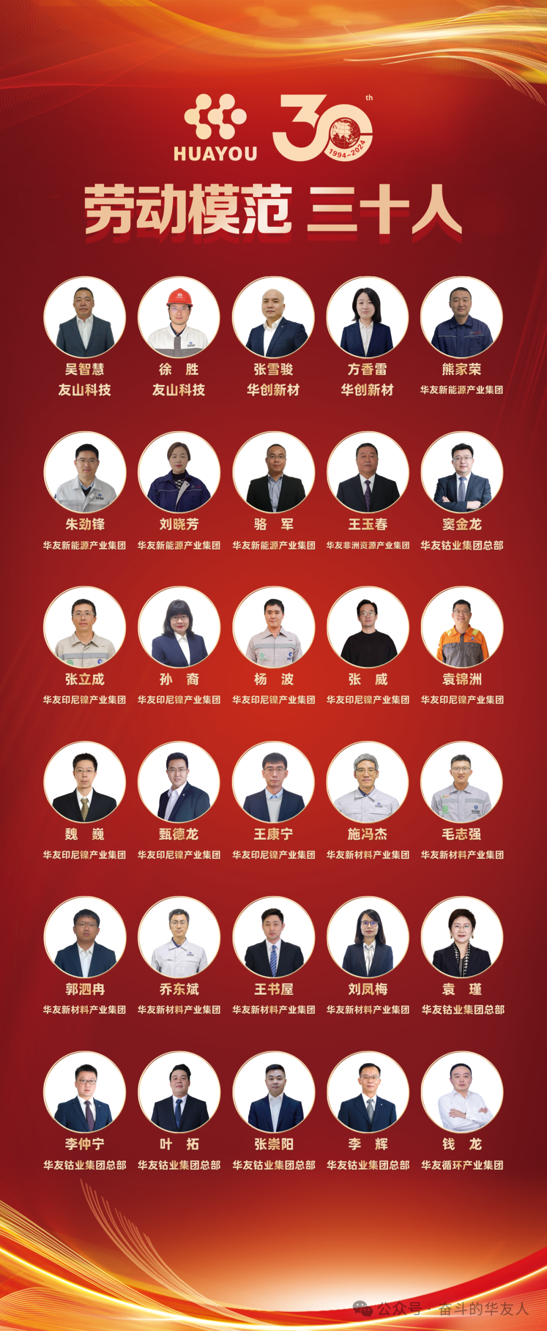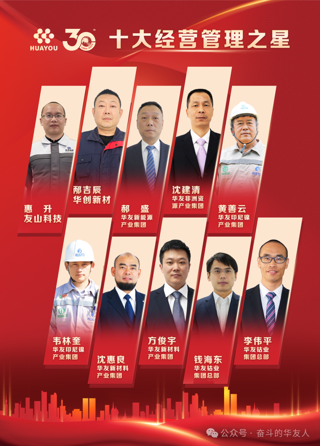砥砺前行铸辉煌,风雨兼程谱新章。华友自默默蓄力到扬帆起航,三十载峥嵘岁月,涌现出一批又一批奋斗的华友人。12月7日,在华友创业三十周年庆典上,对三十周年劳动模范、十大经营管理之星、十大科技创新之星、十大海外奋斗之星获得者进行隆重表彰。